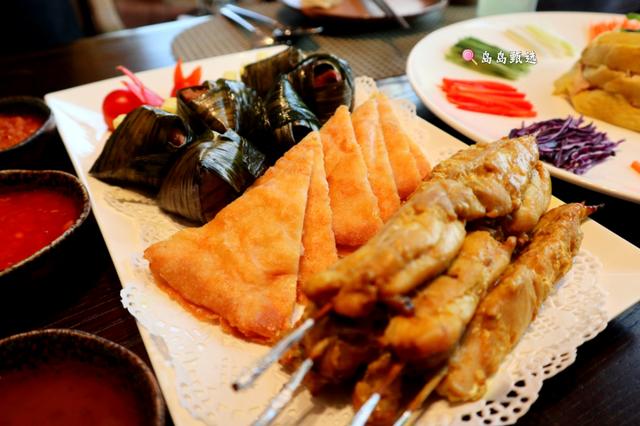 在泰国,你会发现有很多小吃大部分都是油炸或烤的。我们点了份泰式小吃拼盘,里面足有三种小吃,香兰叶包鸡、泰式香脆虾饼还有鸡肉串,还分别搭配了三种不同的酱料。香兰叶包鸡配香辣酱,泰式香脆虾饼配梅子酱,而鸡肉串一定要配沙爹酱。岛岛最喜欢香兰叶包鸡了,要知道香兰叶是泰国最普通的食材,在泰国它会频繁地出没于人们的日常生活中,其本身自带柔和的香气。腌制入味的鸡肉用香兰叶包裹后再炸,不仅可以保持鸡肉滑嫩不柴的口感,香兰叶的香味也封锁在了鸡肉里,蘸着香辣酱,哇!一口一个停不下来。