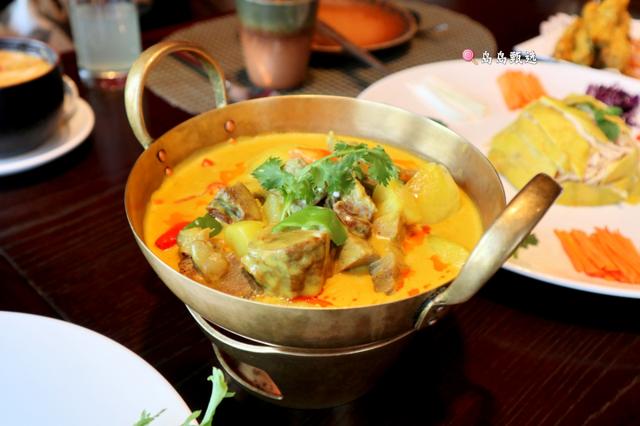 泰国的咖喱按照颜色大致可以分为三种,加入黄辣椒的黄咖喱,口感浓郁温和而顺滑,搭配猪牛羊鸡,蔬菜等都很百搭,适合拌饭。加入绿辣椒和罗勒的绿咖喱,口感清香微酸,带有奶香,适合搭配海鲜和鸡肉。还有加入红辣椒的红咖喱,口感辛辣微甜,适合搭配牛羊肉,压住其膻味。我们点的牛腩咖喱,里面选用的是泰国的黄咖喱,这种咖喱更适合国人的口感,吃起来比较顺滑。牛腩瘦肉较多,脂肪较少,筋也较少,加上炖煮的时间恰到好处,牛腩味道香浓醇厚,入口也是软烂入味。这时候再来上一碗白米饭,当真绝配。