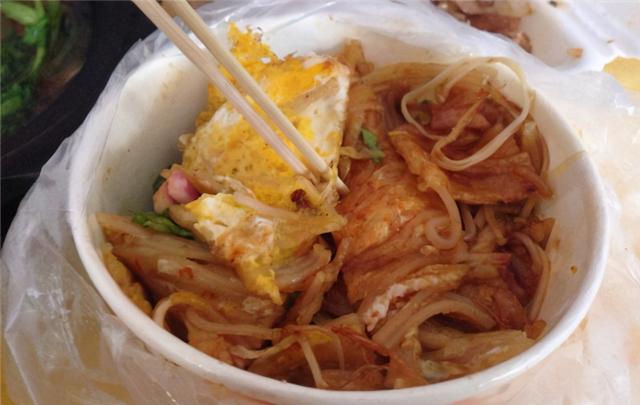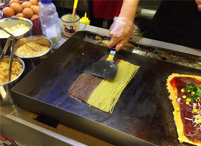 不正宗但很常见的烤冷面——用的是面片,同样放在铁板上加热,会加入鸡蛋、火腿肠等配料,想加什么加什么,最后用铲子切开,吃的时候,面片略带嚼劲,但几乎吃不到什么面香。
