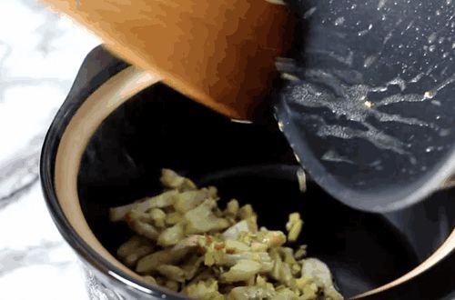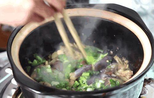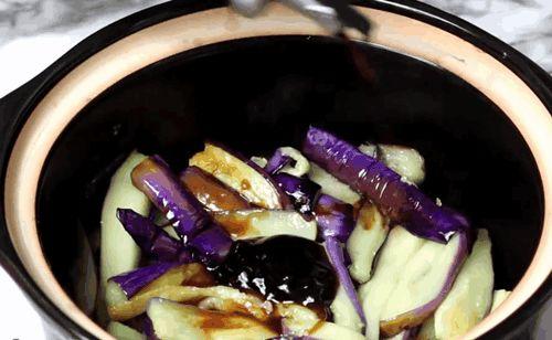 4.调味需三样。茄子都到砂锅来了,这时候便可以加入这调味的主要三样调料,分别是蚝油、生抽、盐,其它调味都不需要了,这样的味道已经很足。加入适量以后,搅拌均匀。
