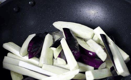 3.茄子泡完盐水以后经过清水冲洗,然后挤干水份。炒锅再次热油,这次油多一些,比平常炒菜多一点就行。下茄子翻炒,煎炒大概2-3分钟,茄子变成金黄时捞出沥油,并转到砂锅里一起。