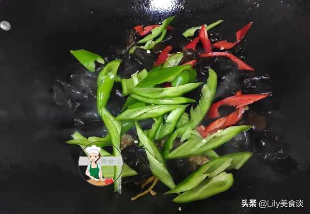 1、木耳提前泡发清洗干净待用。青红椒去籽洗净切条待用。