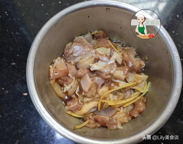 2、鸡腿肉去骨切小块,提前腌制一下,这样炒的时候更容易入味。