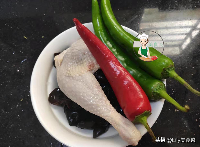 准备食材:鸡腿一个、木耳适量、青红辣椒各一根、大蒜、生姜丝少许。配料:油盐适量、蚝油、生抽、料酒适量、豆瓣酱少许。