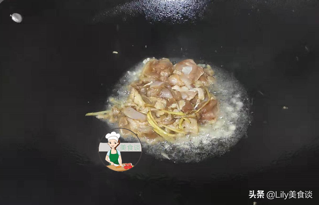 6、加入提前腌制好的鸡腿肉下锅煸炒。