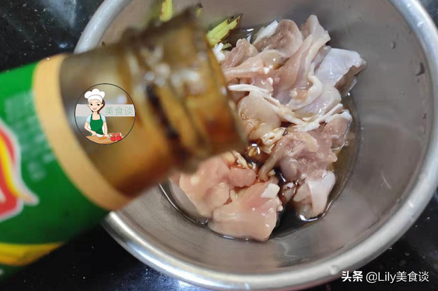 3、鸡腿肉里加入姜丝、适量料酒,生抽和蚝油。