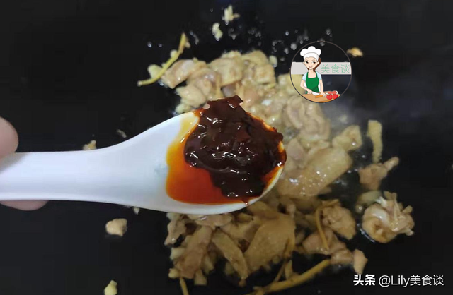 7、将鸡腿炒至变色,加入适量豆瓣酱翻炒均匀。鸡腿肉切小块后很容易炒熟。