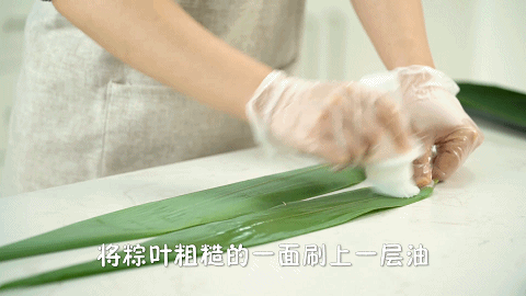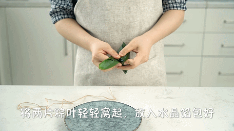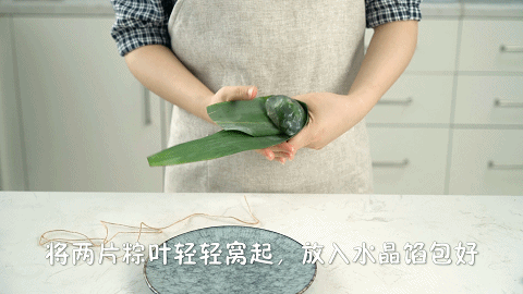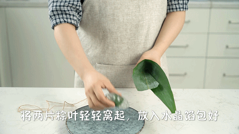 16、将两片粽叶轻轻窝起,放入水晶馅包好