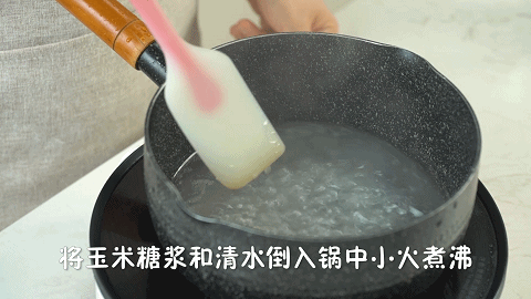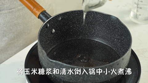 2、往不粘锅倒入300克玉米糖浆、100克清水,一边搅拌均匀,一边用中小火煮沸