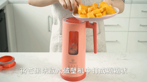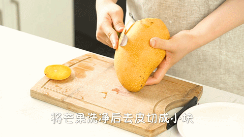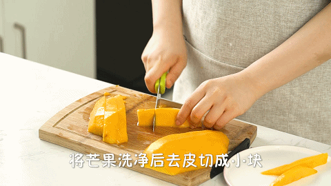 8、继续做芒果馅:将1个芒果去皮后切成小块