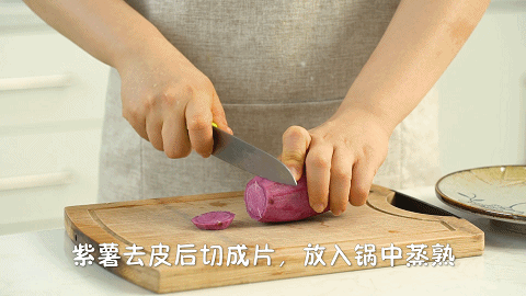 6、然后做紫薯馅:将1根紫薯去皮后切成片,放入锅中蒸熟
