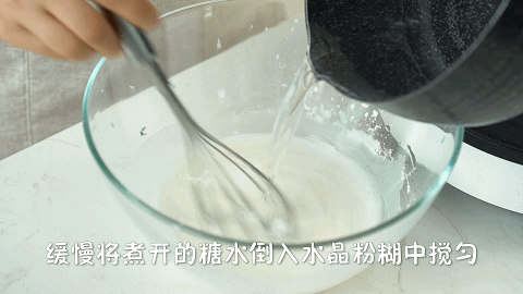 3、把烧开的糖水缓慢加入拌好的水晶粉糊中,边冲边搅拌,不要停,会结块,一定要弄均匀!