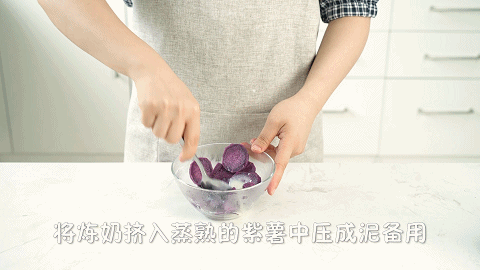 7、加入适量的炼乳压成泥,紫薯馅就做好了