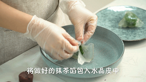14、用水晶皮依次将所有馅料都包裹起来,并捏紧收口备用