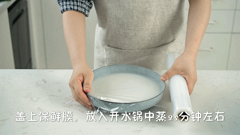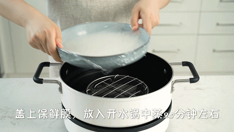 4、混合均匀后,盖上保鲜膜,上锅大火蒸25分钟至完全透明,取出放凉至不烫手备用
