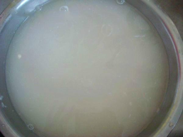 1、找个干净的塑料盆,装一盆清水,水里加一勺白面粉,就是家里常用的那种,馒头粉、饺子粉都可以;搅拌均匀就变成一盆“面汤”了↓