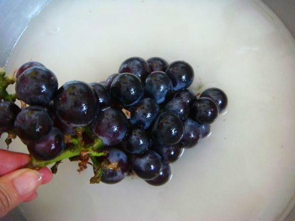 3、等“面汤”变得浑浊后,就可以拎出来,倒掉面汤了,把葡萄用流水冲洗几遍, 就能洗得非常干净,表面光滑,晶莹剔透,可以放心吃啦!