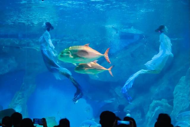 据悉,在中秋节期间,游客们除了能看到北极熊、白鲸、海豚、企鹅等稀有海洋萌宠外,还能在鲨鱼馆内观看中秋水下汉服秀(每天仅两场)。在鲨鱼池演出现场,身着汉服的演员们,在水下与沙虎鲨、护士鲨、黑鳍鲨等鲨鱼共舞,古风雅韵袖舞流年,演员身上的绫罗绸缎在浮力和光影的作用下,更显飘逸唯美,引人入胜,令在场观众啧啧称奇。