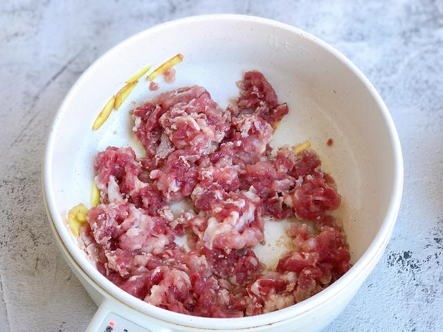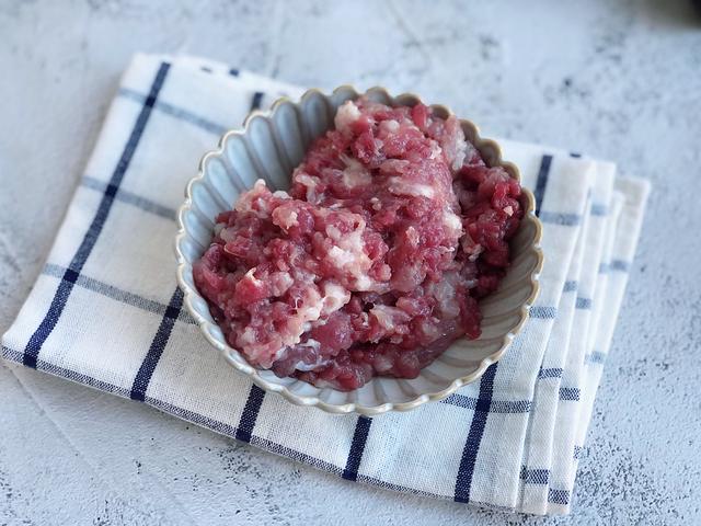 我们将瘦肉切成小块,再慢慢剁成肉泥。如果觉得麻烦的话,可以用绞肉机绞成肉泥。