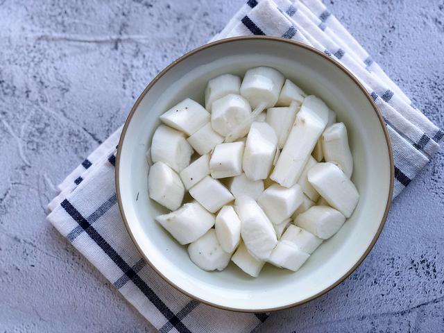 我们先将山药削皮,切成小块,放入水中浸泡一下,以免遇到空气氧化变黑。