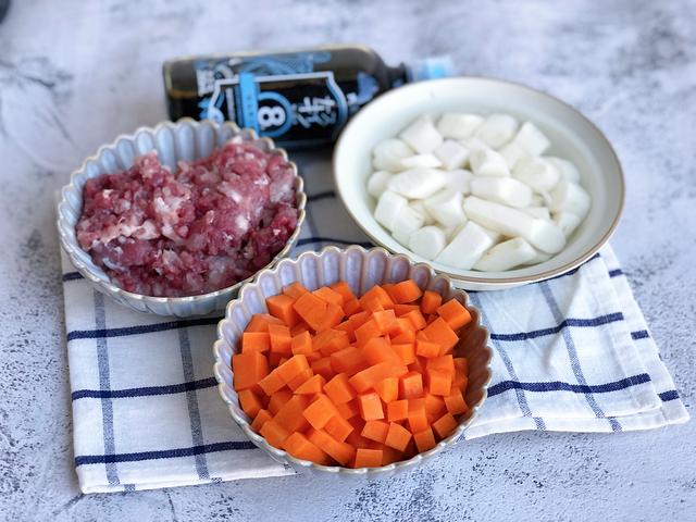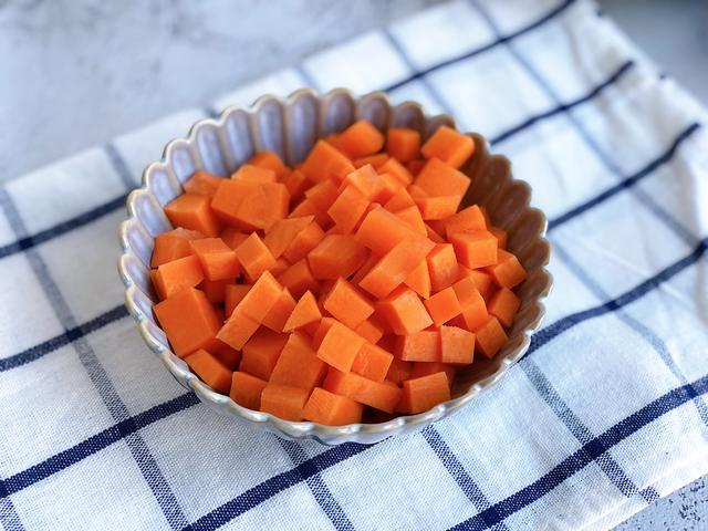 将胡萝卜削皮切成细丁,放入碗中备用。胡萝卜是我们日常很常见的蔬菜之一,除了含有丰富的胡萝卜素之外,还含有钙、铁等多种营养物质。秋天多吃点胡萝卜能健脾养胃,又能提高身体免疫力。