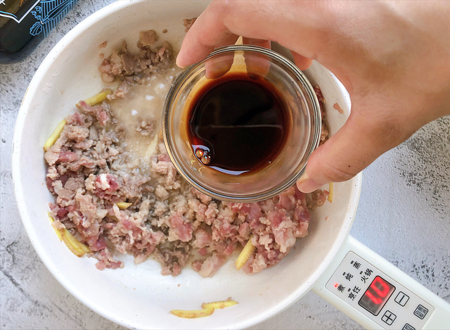 再将肉泥下锅,小火慢慢煸炒至变色,加入1小勺生抽,煸炒入味。经过煸炒好,肉泥熬粥时肉香味更浓哦,而且还不会有腥味。