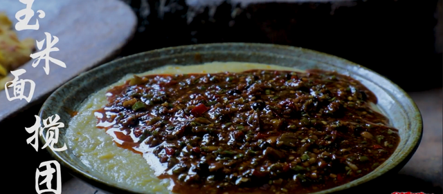 这个叫玉米面搅团,是我们陕西的地方特色美食。制作时,将水烧开,一边下入玉米面粉,一边用棍子搅拌,直到粘稠搅不动时,再参入开水,将搅团切割成小块,加火煮熟,接着继续搅拌均匀,浇上料汁,配上一些绿菜,就可以开吃了,酸辣爽口,吃了会上瘾哟!俗话说“搅团要好,72搅,搅团要燃,沟子拧圆”。不过我们现在大多是用小麦粉做的,没有玉米面搅团那样好吃了。