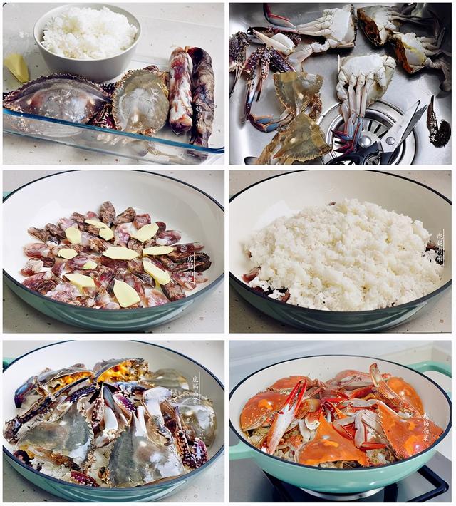 材料:梭子蟹3只,自制香肠2段,米饭3小碗