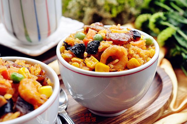做法:1.腊肠切片、香菇切小丁,葱姜切末,大米洗净,北极虾剥出虾仁待用。