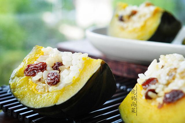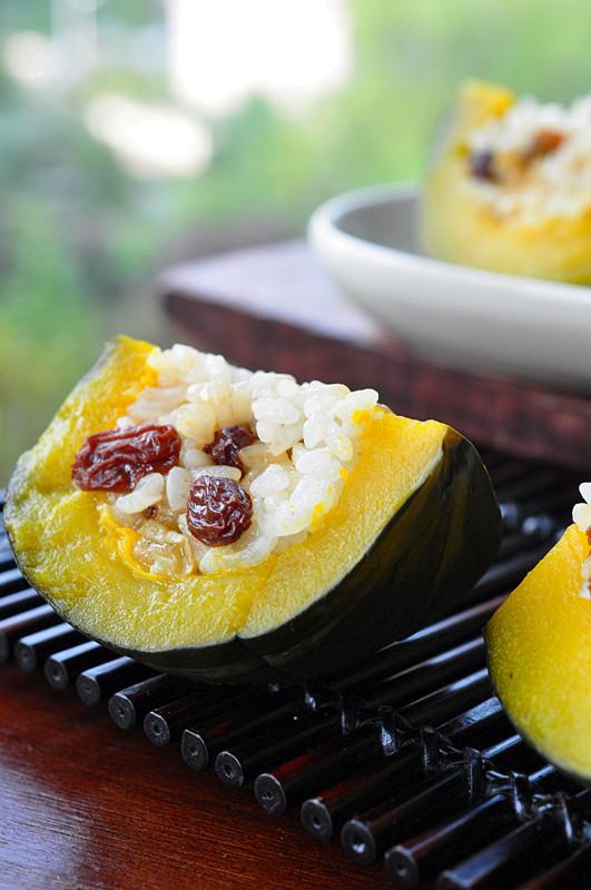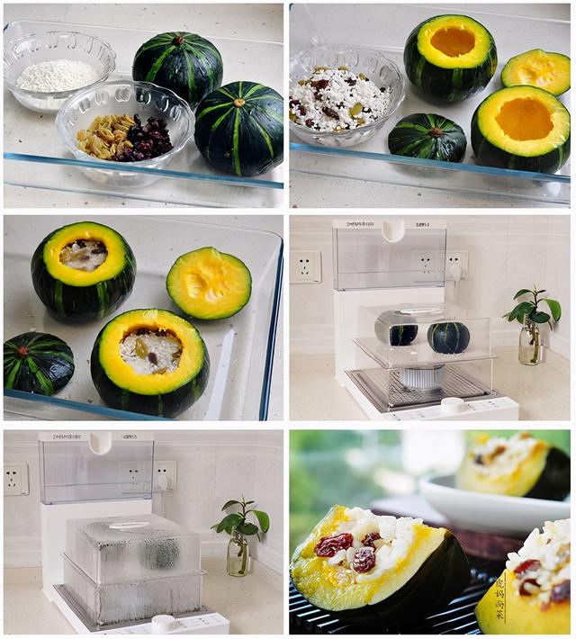 材料:贝贝南瓜2个,糯米1杯,白葡萄干1把,黑葡萄干1把