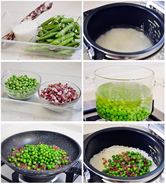材料:大米2杯,香肠1根(130克),豌豆粒180克。