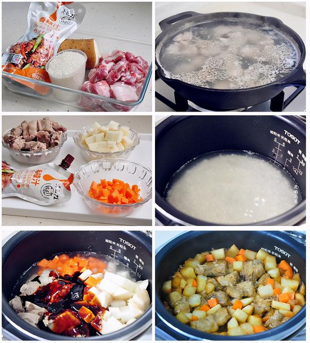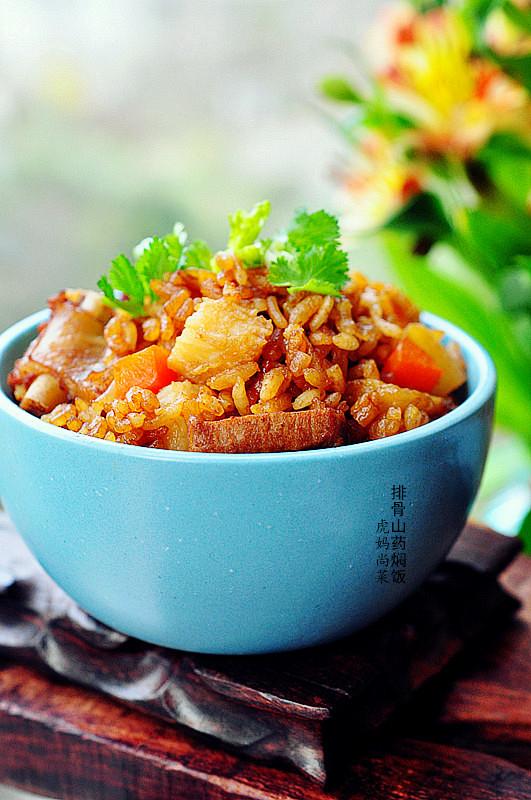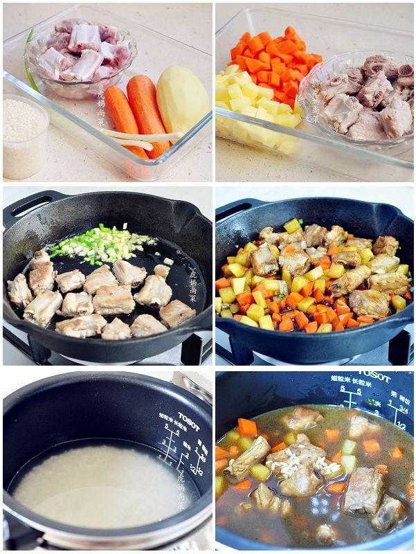 材料:大米2杯,肋排350克,山药250克,胡萝卜50克,香辣汁1袋。