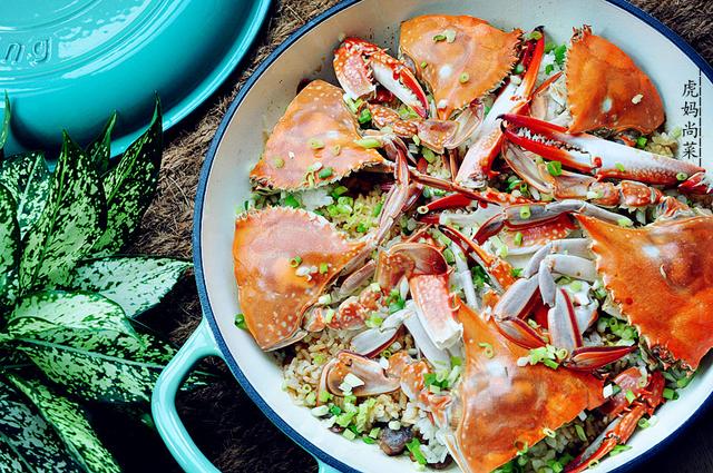 梭子蟹别买太大的,小点的好熟。最好用浅口的大平底铸铁锅,让食材尽可能的平铺整个锅底,受热面积大且均匀。