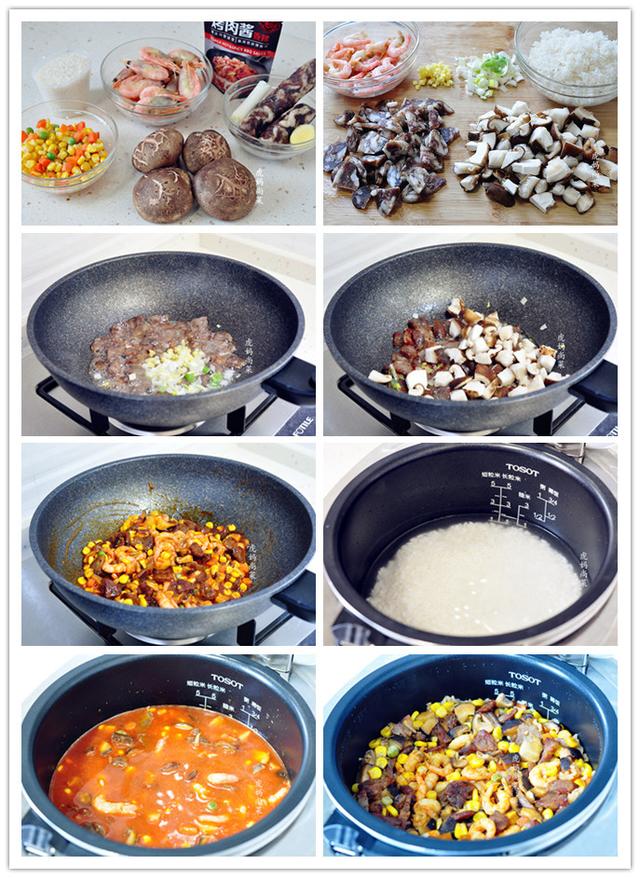 材料:大米2杯,香肠1根半,北极虾1碗,鲜香菇4个,杂菜80克,韩式烤肉酱1袋