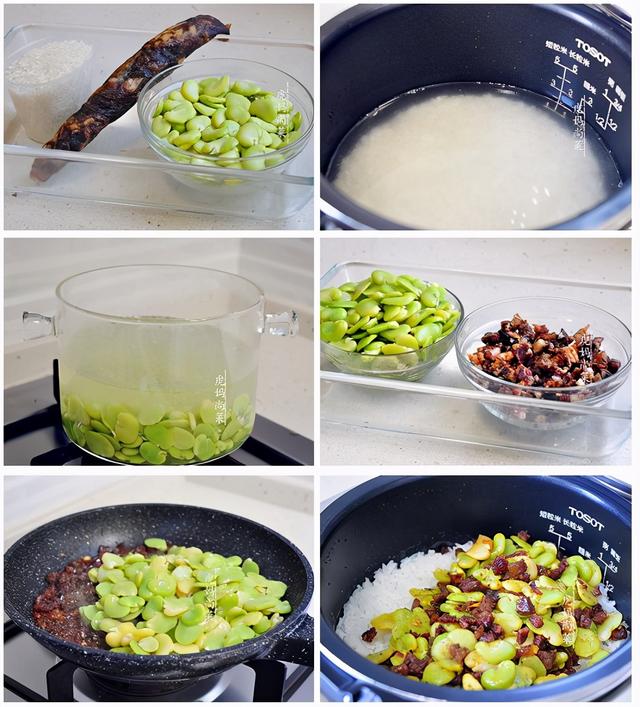 材料:大米2杯,麻辣香肠1根(130克),蚕豆200克。