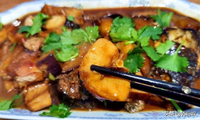 4.小火炖15分钟后,开大火收一下汤汁,将汤汁收浓稠后,关火,将鱼肉装入盆中,撒上适量的葱花和香菜点缀增香,一道营养美味的黑鱼烧茄子就做好了!