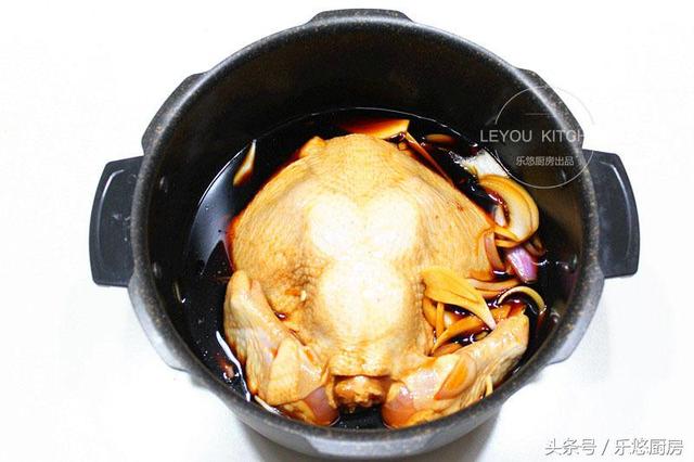 第六步:整鸡腌好后,把鸡肉连料汁一起放入电饭锅中,盖好锅盖,按下煮饭按钮,煮饭结束后,再焖1个小时。