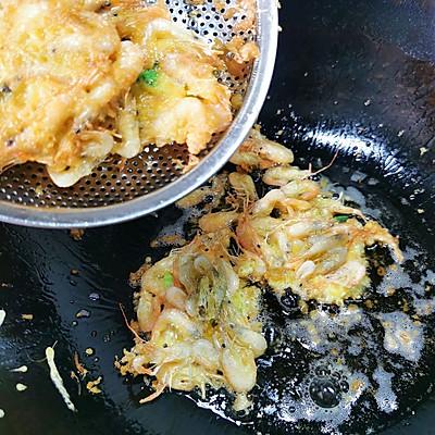1、买来的鲜活小河虾洗净沥干水,打个鸡蛋,加适量面粉,盐,葱,少许糖搅拌均匀2、热油中火用勺子一勺勺下入河虾正反面油炸,注意油温不能