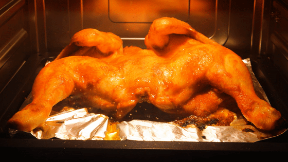 5、烤箱预热,上下火220度,烤45分钟,时长看自己烤箱的情况适当调整。(我的鸡比较小所以不用烤太久,如果你的鸡比较大,可以多烤个15分钟左右。烤40分钟后建议时不时去顾着烤鸡,防止烤焦了。)