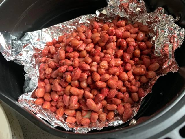 如果想吃油酥花生的味道又不想碰油的,可以用空气炸锅烤。用油纸装上适量花生,直接放进空气炸锅,如果只是想烤干,温度设置100度,烤40分钟左右;如果想完全烤熟,150度烤30分钟。
